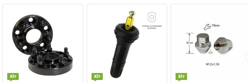 На сторінках магазину з’являються новинки, хіти продажів і товари, що йдуть у замовленнях майже щодня. До них належать розбірні вентилі TPMS типу VDO TG1B, гайки A342145 для Ford, вентилі TR413, проставки для Infiniti, Nissan і Renault, ніпелі TR525 у різних кольорах, болти під ключ 19 чи 21 мм, а також нові позиції для Tesla. Кожна одиниця супроводжується фото, характеристиками й точною ціною, тому замовлення не викликає труднощів навіть у тих, хто вперше стикається з заміною кріплення.