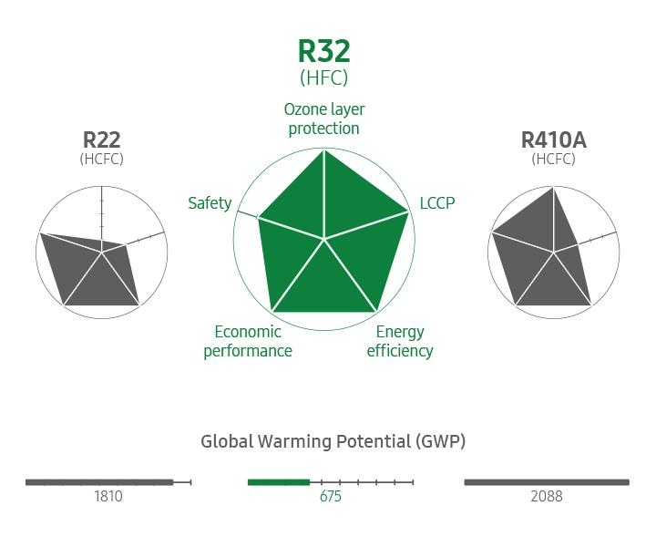 Отдельного внимания заслуживает переход на хладагент R32, который имеет потенциал глобального потепления (GWP) около 675, что почти в 3 раза ниже, чем у R410A. Европейская инициатива European Environment Agency прямо указывает на R32 как на «переходный стандарт до внедрения полностью углеродно-нейтральных решений».