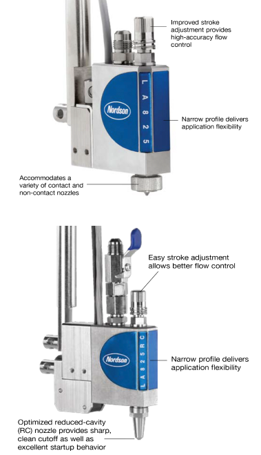 Серед усього асортименту особливо варто виділити кілька ключових продуктів. Наприклад, аплікатор гарячого клею MiniBlue® II славиться найдовшим терміном служби серед пневматичних пістолетів у пакувальній галузі, що суттєво знижує витрати на обслуговування. Електричний аплікатор Sapphire™ забезпечує надвисоку швидкість і точність циклів завдяки технології Hyper Dispense. А система контролю шаблонів LA 404-2 надає гнучкість у керуванні нанесенням завдяки пам’яті на сотню програм.