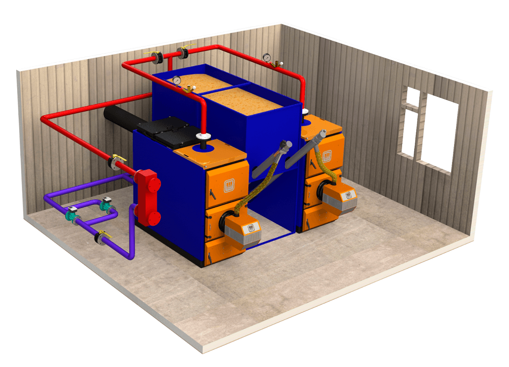 - Полная заводская готовность. Оборудование доставляется в виде контейнера, где уже установлены котлы, бункеры, автоматика и системы безопасности.