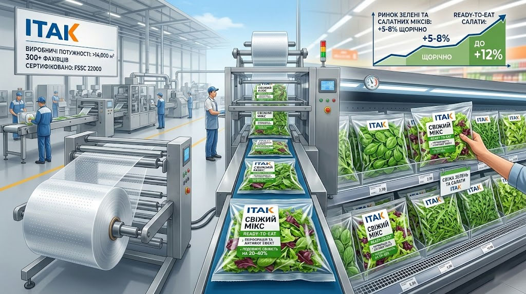 Сегмент свіжої зелені та салатних міксів в Україні й Європі щороку демонструє стабільне зростання на рівні 5–8 %, а в категорії ready-to-eat салатів — до 12 % за даними галузевих оглядів європейських аналітичних агентств. Саме тому упаковка для такої продукції перестала бути другорядною деталлю і перетворилася на стратегічний інструмент збереження якості, логістичної ефективності та продажів. На сторінці https://itak.ua/products/ovochi-ta-frukty-svizha-zelen/ представлено рішення українського виробника ITAK — прозора упаковка флоу-пак з перфорацією для салату та свіжої зелені, яка відповідає сучасним вимогам ринку та холодильного ланцюга постачання.